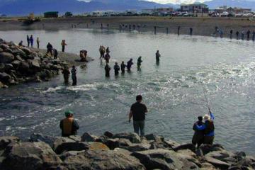 The actual fishing starts two hours before high tide and finishes when the tide wanes. The salmon are constantly on the move unlike in fresh water where they rest in slack water (silver salmon etc, Kings rest behind obstructions). It well may be said that this two-hour window is not always constant everywhere in Alaska where salmon are entering a river so its always wise to have a tide chart handy (charts are also available on line). Our hostess outlined three options as where to stand and fish, the Eastern shore of the spit and cast out into the bay, the exit of the inlet and the shore of the impoundment. Then came a stern warning; if you fish the impoundment do not wade out into the water, the floor of the impoundment drops off suddenly and with waders you'll sink like a stone. Me being me listened half heartedly, with salmon trapped in a hole just how hard can it be to catch a few. We arrived at the Fishing Hole shortly before the salmon were to enter the inlet, our hostess taking a spot facing the Bay, me taking my position facing the impoundment and my fishing partner trying to wedge himself with all the locals crowded around the inlet (being dressed in all of his fly fishing finery he stuck out like a sore thumb against the T-shirt and jeans crowd, he's a doctor which should answer a lot of questions). One oddity I noticed was a preponderance of fly rods being carried by what appeared to be the local residents. I sauntered to where these folks were gearing up to see if I could sneak a peek at just what flies where in vogue. Yikes !!! not flies but cut chunks of herring, on a fly rod no less, must be an Alaska thing.