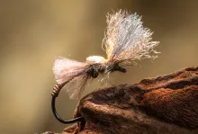 - Run on the thread, fold the ultra-dry yarn around the hook from underneath and secure with cross wraps a little way back from the hook eye. Add thread wraps around the fibres to form the wing post.