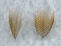 The feather on the right is fairly wide and "thumbnail" shaped, perfect for a shoulder on a Rangeley style streamer. Notice how it retains a broad shape when the base fluff has been removed. The feather on the left is far too narrow for a shoulder, but would serve nicely as the wing on a "flatwing" style streamer.