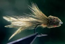 In order to keep the flash and hairs from swinging around the hook, I tie in the materials on top of the hook shank. First a bunch of bucktail midshank, then a bunch of flash. Then repeat the process, maybe with some other colors, just for the sake of variation. This part of the fly will fill maybe a third of the hook shank. In front of this you create a large and messy muddler head by tying on several bunches of deer hair and spinning them around the shank. Compress these first hairs a bit and tie in a second bunch. Keep on doing this until there is only room for a whip finish. You can see a more detailed description on tying muddlers in the article Muddler Mania. Don't worry too much about the appearance of the head at this stage. Whip finish, varnish generously and put the fly aside to dry.
