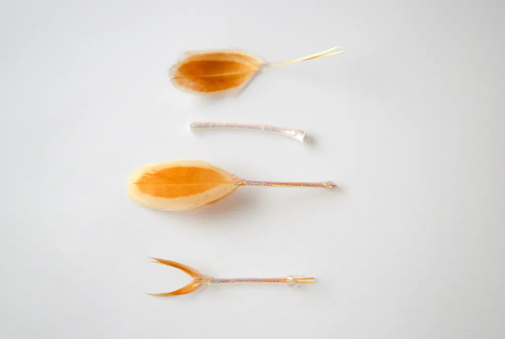 Two hen feathers are stripped and mounted in a piece of Mylar tube