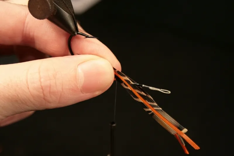 Turn your wise and hold the two merged wings back to back on the hook with your left hand and make a thread loop and tie it down.