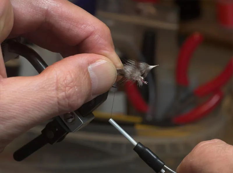 Tie in two small hackle feather as a tail. Set them side-by-side curving out.