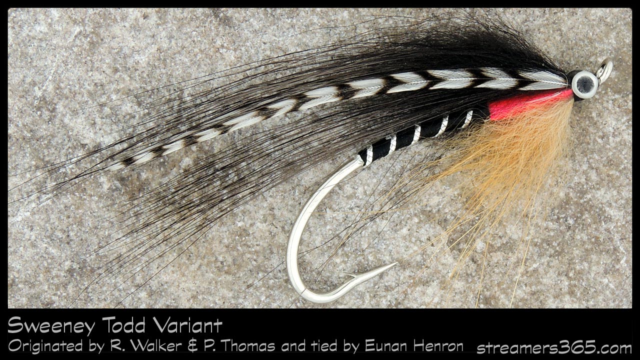 Notes: The original Sweeney Todd streamer was tied without eyes or the grizzly hackle in the wing, but the variant is a lively addition to an already convincing minnow imitation. Some versions of the streamer feature an extra long wing, twice the length of the hook. It is because of the bright magenta spot on the hook that the pattern does not suffer from the added length, giving predators a target to smack rather than nip at the tail end. See the video below for Davie McPhail's fly tying tutorial of the Sweeney Todd Variant.